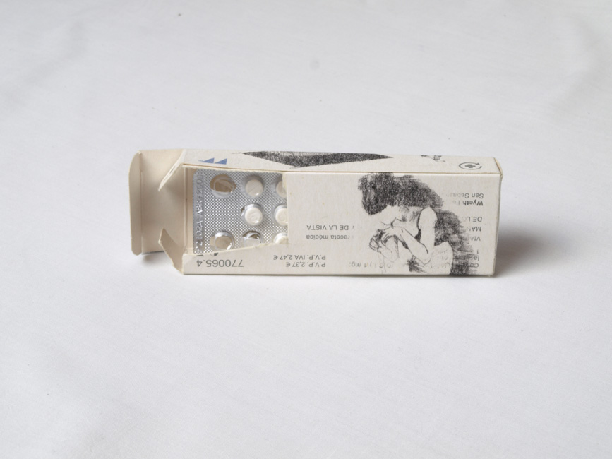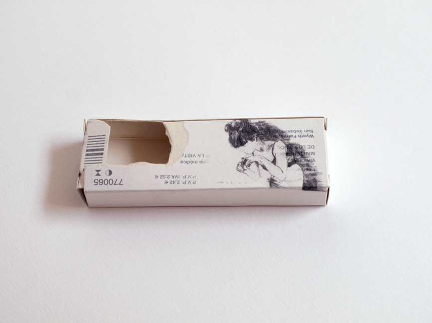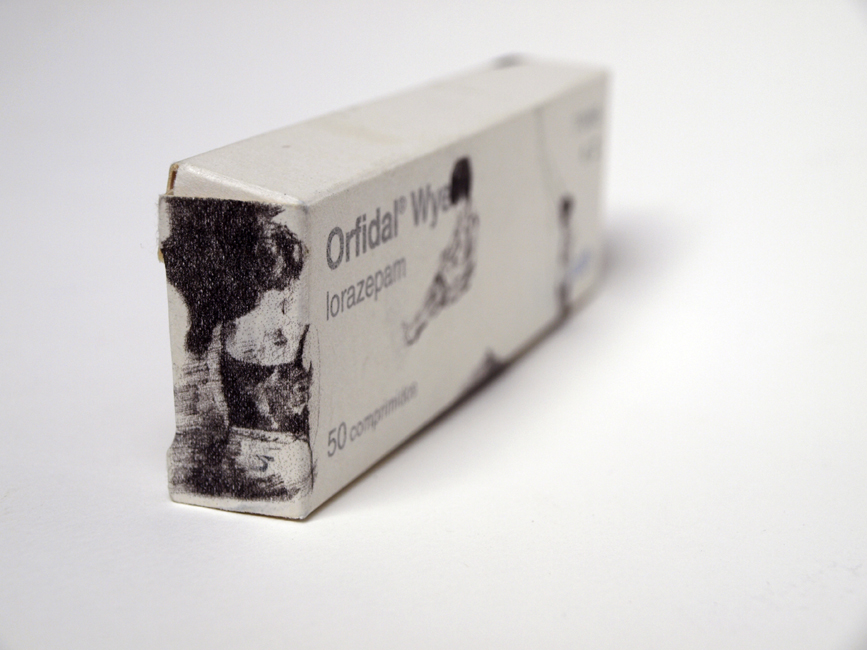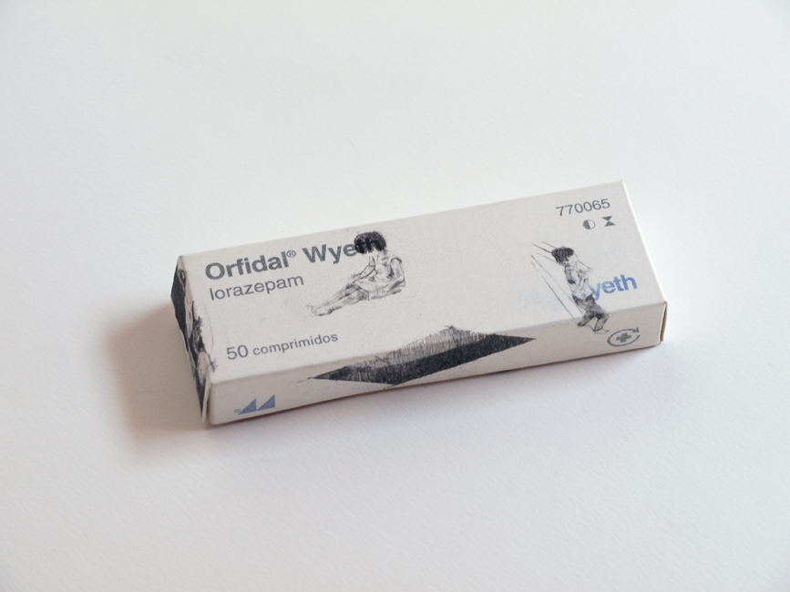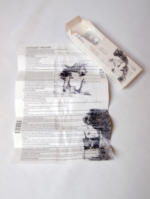 Sueño inducido. Auto-huída es una pieza que se incluye dentro de la serie del proyecto Soledad con espectador .Este un proyecto que investiga las posibilidades del dibujo y de su hibridación con otros medios al mismo tiempo que critica y cuestiona preguntas en torno a las soluciones que la sociedad brinda al individuo contemporáneo para resolver sus problemas de ansiedad. Se trata de una intervención sobre cajas de medicamentos, y sus prospectos, indicados para paliar los síntomas de esta misma, de la depresión, la esquizofrenia o la bulimia nerviosa…, entre otros.